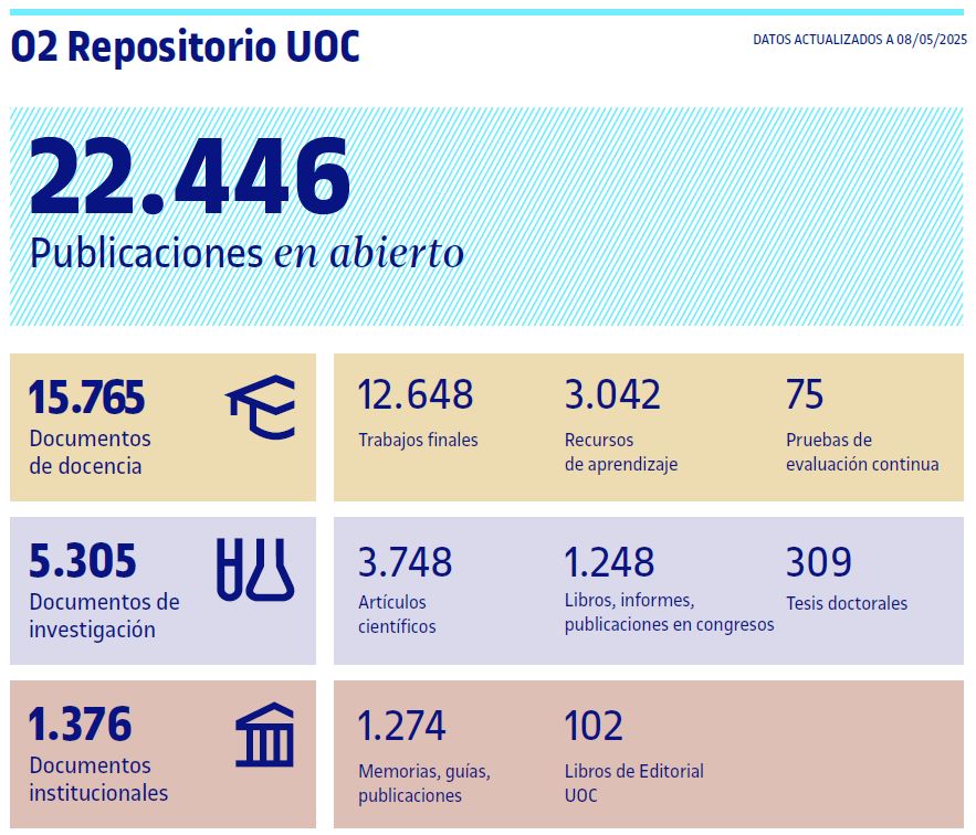 Actualmente, el O2 ya cuenta con más de 22.000 publicaciones en acceso abierto, de las cuales más de 15.700 corresponden a publicaciones de docencia, más de 5.300 a investigación y más de 1.300 a documentos institucionales. A continuación, podéis consultar una infografía que ilustra más en detalle la distribución de estas publicaciones:
