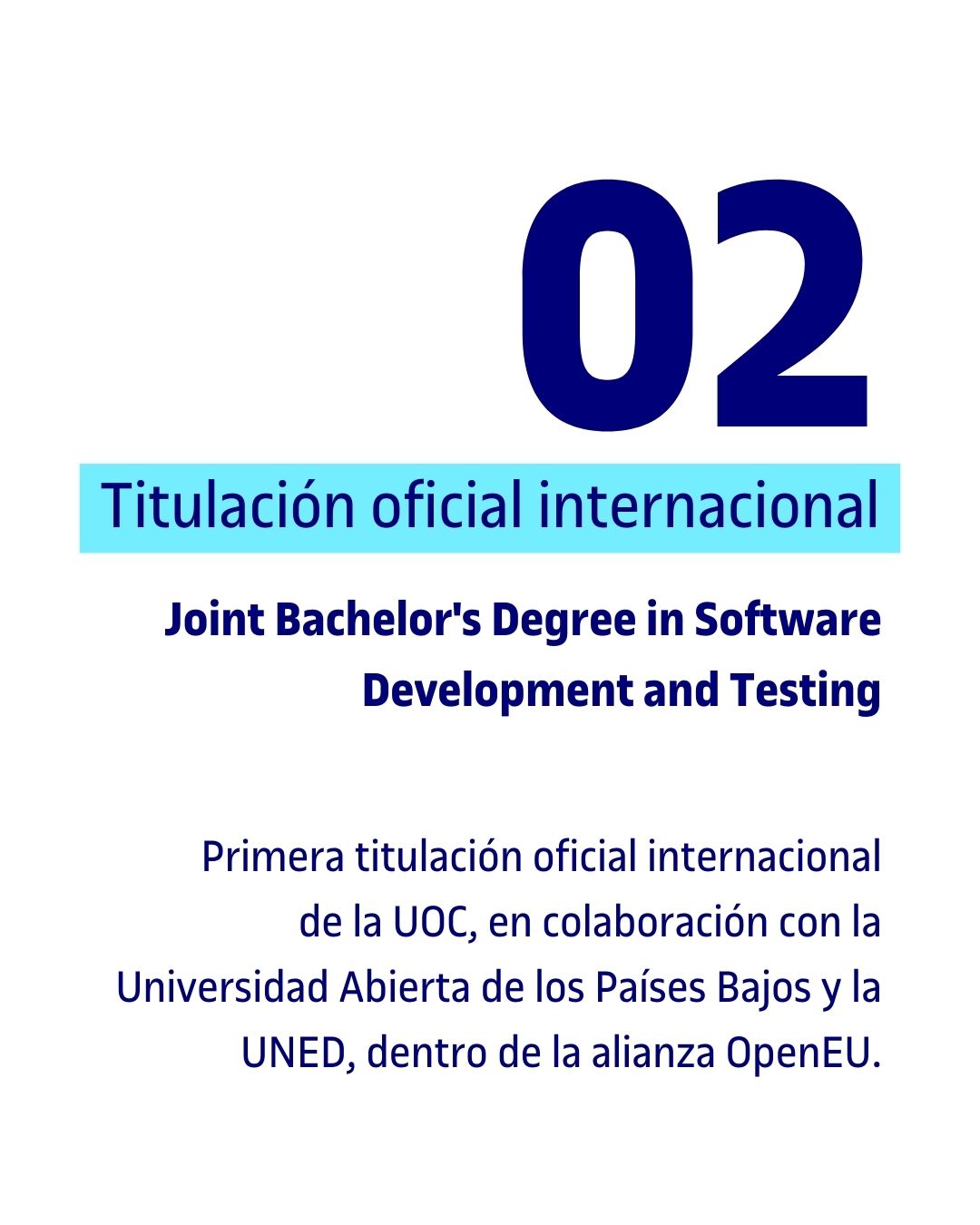 El grado de Gestión de la Sostenibilidad, Transformación Digital y Medioambiente, ofrecido por los Estudios de Economía y Empresa de la UOC, empezará a ofrecerse durante el próximo curso. Es una de las novedades oficiales de la universidad, junto con el Joint Bachelor's Degree in Software Development and Testing, que la UOC ofrecerá íntegramente en inglés, junto con la Universidad Abierta de los Países Bajos (OUNL) y la Universidad Nacional de Educación a Distancia (UNED), a partir de febrero de 2026 y en el marco de la alianza europea OpenEU. Estas y otras novedades se presentarán en el estand de la UOC del Saló de l'Ensenyament, que podrá visitarse del 26 al 30 de marzo en Fira de Barcelona.
