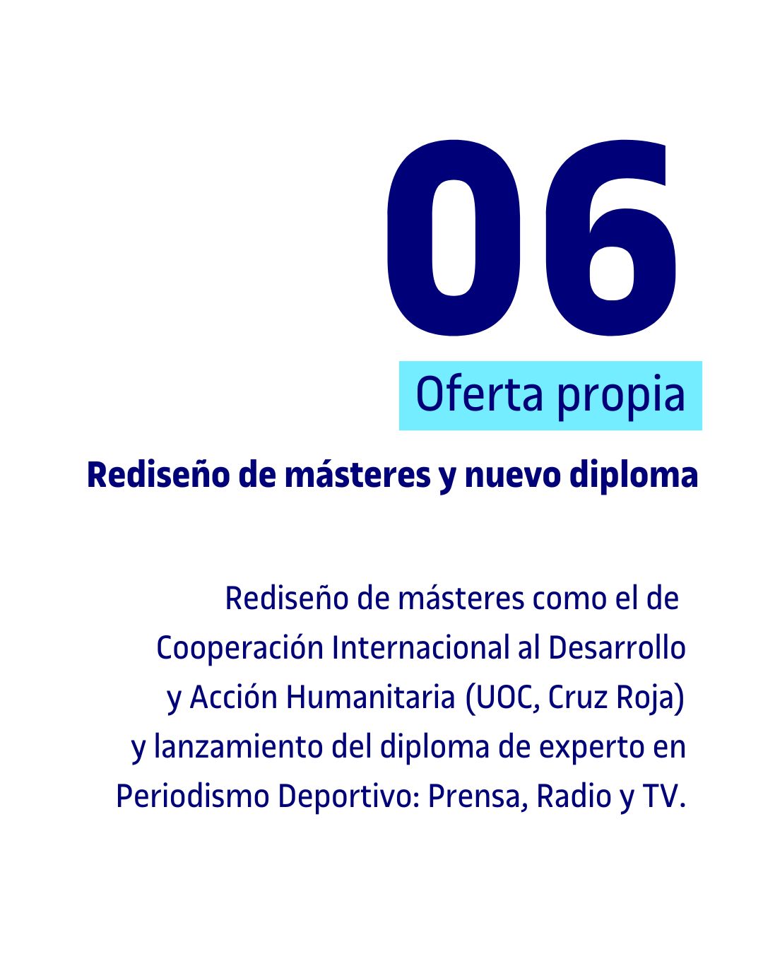 La UOC también rediseñará el máster de Cooperación Internacional al Desarrollo y Acción Humanitaria (UOC, Cruz Roja), el diploma de especialización de Gestión de Proyectos de Cooperación Internacional al Desarrollo y Acción Humanitaria (UOC, Cruz Roja), y el diploma de experto de Gestión Estratégica y Logística en Cooperación Internacional al Desarrollo y Acción Humanitaria (UOC, Cruz Roja).