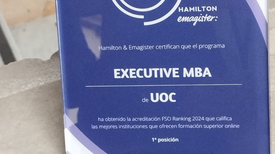 El programa Executive MBA de la UOC es el mejor MBA en línea de habla hispana del mundo, según el ranking de instituciones de formación superior en línea (Ranking FSO) 2024 de la consultora Hamilton Global Intelligence, junto con Emagister. En la clasificación se han analizado más de 225 instituciones de España, Latinoamérica y Estados Unidos, y se han encuestado unos 4.000 estudiantes y graduados.
