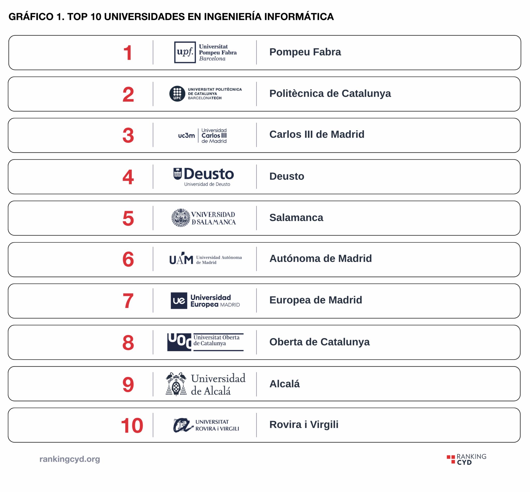 Entre las diez mejores universidades del Estado donde estudiar Ingeniería Informática, uno de los ámbitos caracterizado por los buenos indicadores de empleabilidad, el Ranking CYD 2025 destaca la UOC. Además, también la clasifica con muy buena puntuación en cuanto a inserción laboral del estudiantado que cursa estos estudios.