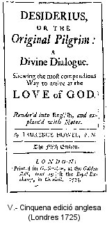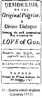4. Desiderius, or the Original Pilgrim. A divine dialogue shewing the most compendious way to arrive at the love of God. Londres, 1717. Imprès per William Redmayne. Traducció de Lawrence Howel. 190 pàgs.; 12au. Aquesta edició conté un prefaci del mateix Howel, on tracta de les diferents traduccions i imitacions que s’han fet de l’Spill..., especialment de l’obra de Symor Patrick The parable of the pilgrims (London, 1667 i 1673). Howel condensa força l’original, suprimeix la forma dialogada i la divisió en capítols i es pren moltes llibertats amb el text, segurament per tal d’acostar-lo als lectors protestants. Howel, autor "d’algunes obres polèmiques i d’una curiosa A complete history of the Bible, amb 150 gravats de Sturt, i en 3 vols., publicada a Londres l’any 1729, va acabar els seus dies a la presó de Newgate, l’any 1720 (Ricart 1965). Sembla ser que aquesta edició es va reimprimir cinc vegades entre 1717 i 1725. Com a mínim, un d’aquests exemplars va arribar a l’Amèrica del Nord. El dirigent quàquer i abolicionista John Woolman (Ancocas —avui Rancocas—, Nova Jersey, 1720-York, Anglaterra, 1772), en posseïa un i el recomanava i deixava als seus amics. Se’n conserven dos exemplars a la British Library: 852.h.13 —té les pàgines 9 i 10 mutilades— i 4410.e.14 —exemplar de la tercera edició; un a la Hougton Library de la Harvard University, a Cambridge, Massachussetts: *SC5 Sp453 Eg717h, i un altre al Garret Technological Seminary, d’Evanston, Illinois (British 1980 i 1981).