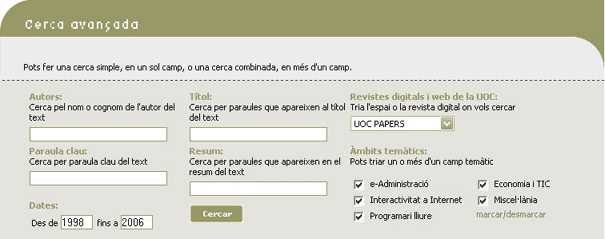 A partir del segon número ja es poden consultar tots els articles de UOC Papers i de la resta de publicacions digitals de la UOC per autor, títol, resum, paraules clau, data de publicació i àmbits temàtics.
