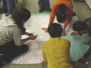 El moment de muntar la retícula en l'activitat REN, portada a terme dins l'assignatura de net.art del graduat multimèdia al CITM de Terrassa l'any 2001 (Foto: Josep Maria Bergua)