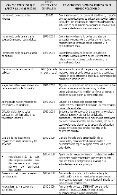 La combinació de tants factors en un temps relativament curt va generar primer un estadi crític (entre els anys seixanta i setanta) i després una etapa intermèdia en què les universitats canvien sense que siguin el motor del procés innovador, sinó més aviat implantadors semirefractaris de canvis que s'han decidit en l'àmbit polític o requerits per la competència o altres pressions externes.