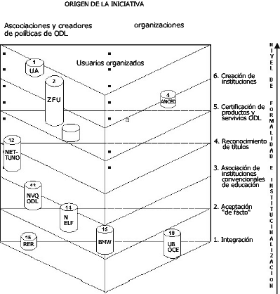 L'establiment de consorcis i institucions especialitzades per part de les autoritats públiques o d'un grup d'universitats respectables o d'organitzacions formatives (normalment amb el suport de les autoritats públiques responsables i la inversió econòmica corresponent). Els exemples del Consorzio Nettuno i de l'Open Learning Foundation demostren com l'ODL s'ha convertit en una prioritat reglamentària col·lectiva per a institucions respectables ja existents mitjançant la creació d'una nova entitat.