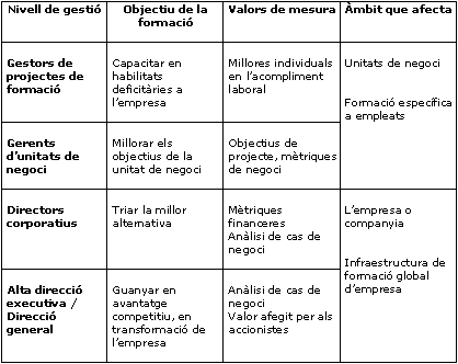 A diferents nivells de gestió es corresponen diferents tipus de decisions, de la mateixa manera que diferents nivells d'objectius. I per això quan parlem de formació a l'empresa hem de tenir sempre clar a quin nivell de gestió i, per tant, de decisió, ens adrecem. Jay Cross duu a terme una aproximació interessant a la negociació dels programes de formació a l'empresa; exposa que quan es parla de rendibilitat de la formació depèn sempre del lloc que s'ocupa a l'empresa.[2] Podem veure-ho de manera resumida a la taula següent.