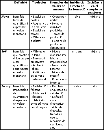 La complexitat de la formació, derivada de la complexitat dels mecanismes d'aprenentatge de les persones, fa imprescindible la simplificació dels conceptes i la seva traducció a realitats quantitatives. El repte no és fàcil, ja que els beneficis més productius de la formació són els més intangibles, mentre que els més operatius, els més tangibles, si bé produeixen resultats a curt termini, es deuen al resultat de coneixements mecànics. W. Horton mostra una excel·lent proposta de categorització dels beneficis que reproduïm modificada a la taula següent.[10]