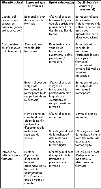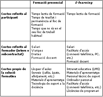 Però, com podem valorar els costos de la formació, especialment els de l'e-learning? Sembla que l'e-learning és la gran solució, ja que, d'entrada, no sols redueix, sinó que elimina els costos de viatges, dietes i lloguers d'aules de la formació tradicional. Efectivament així és i encara n'hi podríem afegir d'altres de menys usats, com ara els costos de distribució de materials o els costos de temps dels empleats que es formaran. Observem-ho amb una mica més de detall a la taula comparativa següent:
