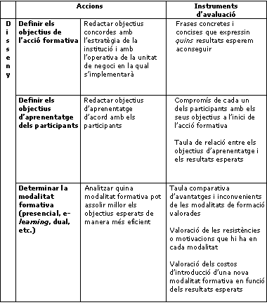 Avaluar per a millorar és el resultat de l'acció coherent de dissenyar els elements de valoració d'una acció, alhora que es planifica el desenvolupament de la mateixa acció. A la taula següent podem observar, d'acord amb el que hem exposat fins ara, una sèrie ordenada d'accions que cal desenvolupar per al disseny d'una acció formativa a l'empresa, amb una llista de possibles instruments d'avaluació.
