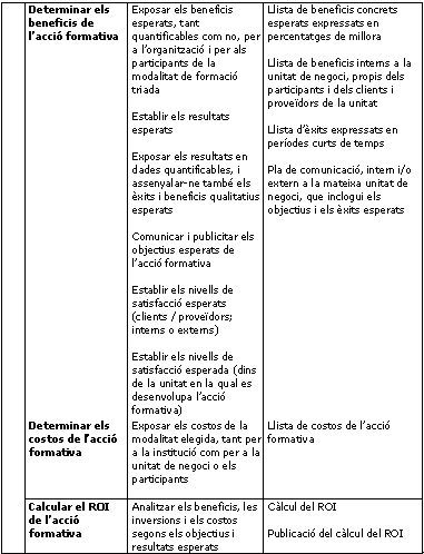 Taula traduïda i adaptada per l'autor a partir de la de Jay Cross, a A fresh look at ROI (www.learningcircuits.org/2001/).