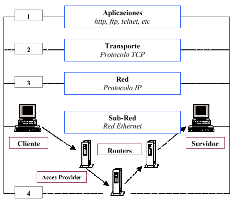 3. El Protocolo de control de la transmisión viaja (envía los paquetes) sobre el tercer nivel, es decir sobre el nivel de red, que a su vez utiliza un protocolo específico, denominado Protocolo de Internet (IP: Internet Protocol). Es decir, TCP viaja sobre IP, lo que gráficamente se acostumbra a designar como TCP/IP. El Protocolo de Internet permite conocer al servidor, en este caso, cuál o quien es el destinatario final de la información, en función de la dirección impresa que lleva la máquina cliente así como la dirección que dicha máquina reclama. Por último, en relación con los niveles red y sub-red, si se tiene en cuenta que en éste se encuentran las conexiones concretas y los Routers que escuchan los paquetes de información numerados por el nivel de transporte (TCP) cobra mayor sentido el nivel de red: el Protocolo IP posibilita al Router del nivel sub-red su función en el nivel inferior y definitivo, pues al llevar IP una dirección impresa, interconecta los Routers entre sí, para que cada uno pueda ir enviando sucesivamente los paquetes de información
