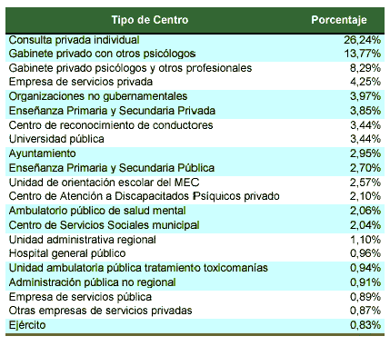 Tabla 3. Tipo de centro en que trabajan los psicólogos según el COP. Tomado de José Ramón Fernández (2000).