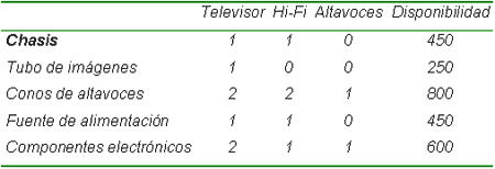 Problema: Una compañía produce televisores, equipos Hi-Fi y altavoces utilizando una serie de componentes comunes, tal y como se indica en la tabla inferior.