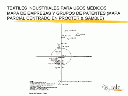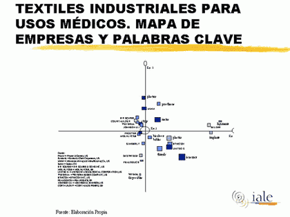 Os puedo exponer otros casos de mapas que hemos confeccionado en IALE Tecnología. En un caso se pretendía saber qué sucedía con los productos textiles para hospitales. Evidentemente, supimos enseguida cuáles eran las empresas líderes y, por ejemplo, estudiamos la coocurrencia entre los nombres de las empresas y los códigos de clasificación de las patentes de la empresa.