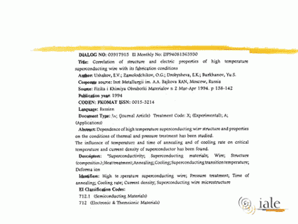Para poner un ejemplo de un registro de base de datos, cogeremos un registro de la base de datos Compendex, de un artículo en ruso obtenido por el distribuidor Dialog. El registro de este artículo está dividido en diversos campos. En primer lugar hay el título del artículo, que puede contener algunas palabras interesantes y que nosotros llamamos "clave", que quizás un ordenador potente equipado con un buen software es capaz de identificar. Después está el autor, la empresa donde se ha hecho el experimento, el año de publicación, la lengua en este caso es un artículo en ruso, el abstract, los descriptores, que son palabras clave que figuran en el tesauro en el índice de la base de datos, y los identificadores, que son palabras clave que no figuran en el tesauro y que normalmente el autor del artículo ha considerado que eran interesantes para definir su contenido. Estas palabras, aunque no estén en el tesauro, figuran en esta base de datos. También hay otros campos, códigos de clasificación, etcétera.
