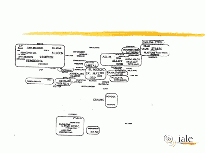 Como el mapa tiene en cuenta los criterios de coocurrencia que he comentado antes, los diferentes campos dentro de la enorme área de nuevos materiales quedan delimitados con precisión. Por ejemplo, en la parte inferior aparece la superconductividad, con palabras como cobre, calcio, estroncio, etcétera. En la parte superior aparecen el silicio y los semiconductores perfectamente caracterizados. También salen, por ejemplo, la pulvimetalurgia, los materiales cerámicos, la sinterización, la superaleación, etcétera. Es decir, tenemos el campo caracterizado y representado en una foto de lo que está pasando en un área determinada, y lo podemos comparar con los mapas de periodos anteriores y observar cómo evoluciona la investigación en estos campos. Es evidente que esto da lugar a decisiones estratégicas.