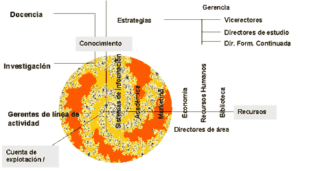 De ahí se deriva que nuestra forma de organizarnos centre la gestión desde y para el modelo educativo y que a la vez transfiera elementos de este modelo al modelo organizativo, como dos caras de la misma moneda. Un ejemplo de ello es la propia virtualización de gran parte de los procesos de trabajo (desde la secretaría académica hasta la selección de personal), o la interacción profesional a través de las herramientas de comunicación del campus virtual o e-campus (la intranet educativa, las agendas electrónicas, las comunidades virtuales, etc.). O también, en otro sentido, el propio énfasis en la formación tanto del personal docente como del de gestión, ya que nos hallamos en una learning organization (organización que aprende) cuya actividad es la educación.
