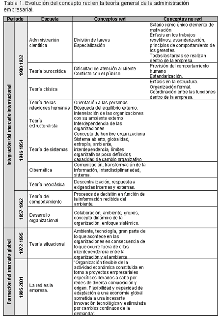 La concepción en red de la actividad empresarial ha sido uno de los elementos centrales del estudio de la teoría general de la administración empresarial. En la figura 1 podemos observar la evolución del concepto red en las diferentes escuelas de la administración. En este sentido, cabe destacar que a partir de la segunda mitad de la década de los noventa, coincidiendo con la privatización de Internet y la progresiva generalización de su uso, una vez alcanzada su masa crítica[3], algunos autores definieron un nuevo marco conceptual.[4]