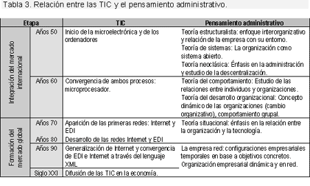 Respecto al pensamiento administrativo, cabe destacar que ha evolucionado paralelamente al desarrollo de las TIC. A partir de los años cincuenta surgen varias teorías que enfatizan la relación de la empresa con su entorno y que basan su análisis en la interpretación de la empresa como sistema y en el estudio de las relaciones entre los individuos y las organizaciones. La teoría estructuralista, parte de la teoría clásica desarrollada por Marx y Weber, se origina por la necesidad de considerar la organización como una unidad social y compleja y establece un nuevo concepto de estructura basado en la relación entre las partes que conforman la actividad empresarial (agentes y entorno económico).