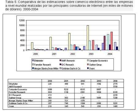 Incidiendo en los resultados obtenidos anteriormente, cabe destacar un nuevo aspecto paralelo a la importancia de las TIC y del cambio organizativo en los aumentos de productividad. Se trata de los modelos de comercio electrónico entre empresas (business to business) como indicador del desarrollo de la actividad empresarial en red y a través de redes informáticas. La tabla 5 muestra una comparativa de las estimaciones de comercio electrónico entre empresas a escala mundial realizadas por las principales consultoras de Internet para el quinquenio 2000-2004. Los resultados más importantes de estas estimaciones ponen de relieve las expectativas de un significativo aumento del volumen de transacciones realizadas a través de la interconexión digital entre empresas.