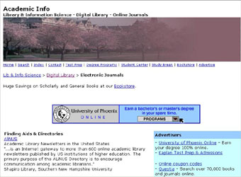 Recull d'enllaços a revistes electròniques sobre biblioteconomia i documentació i a altres recursos inclosos en aquestes revistes. Depèn de l'associació Academic Info, que té com a objectius donar accés als recursos d'educació online i cobrir diferents disciplines acadèmiques. Permet buscar per matèria i per paraula clau. Incorpora una selecció de recursos de referència general i per a estudiants.